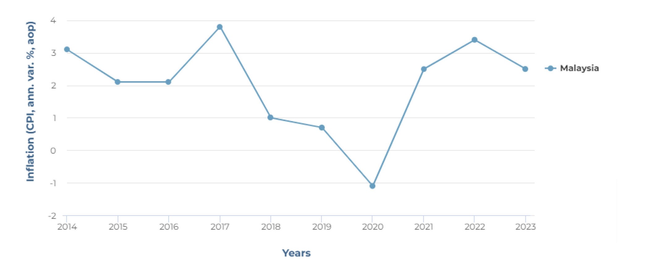 Inflation rate in Malaysia was moderate throughout the year 2023. The annual inflation rate averaged 3.3% due to a steady rise in prices of foods and non-alcoholic beverages, accommodation services, and restaurants (World Bank, 2023). However, by November, 2023, the inflation rate had stabilized to 1.5% as shown in Figure 1 (Leng, 2024). The inflation rate was lower than most of the neighbouring countries including Philippines with 4. 1% and Indonesia with 2. 9% (Leng, 2024). Consequently, the stabilizing inflation demonstrates that the country is recovering from economic shocks